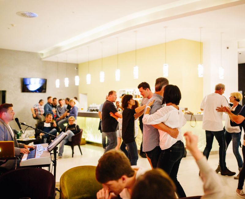 Nach dem Apres Tennis geht’s frisch geduscht zum Abendessen. Bei vielen Köstlichkeiten am Buffet wird Kraft getankt. Anschließend kannst du den Tag bei netten Gesprächen in der Lobby Bar bis Mitternacht ausklingen lassen. Einmal die Woche wird zum Livekonzert gebeten. Ab 21:30 Uhr lassen wir hier den Abend mit Rock, Pop und Austropop ausklingen.