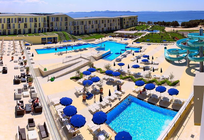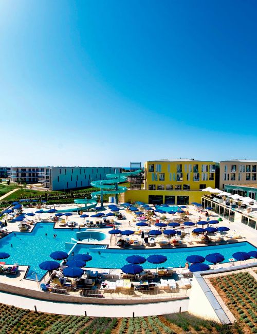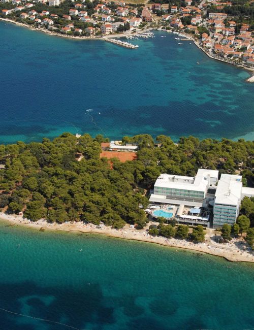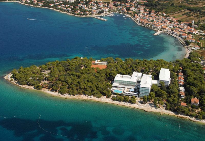 Eine kleine Sand-Kiesbucht befindet sich je nach Lage Ihres Zimmers in ca. 100 m Entfernung. Außerdem wird die ganze Halbinsel von einem Kies- und Felsstrand mit Badeplateaus gesäumt.